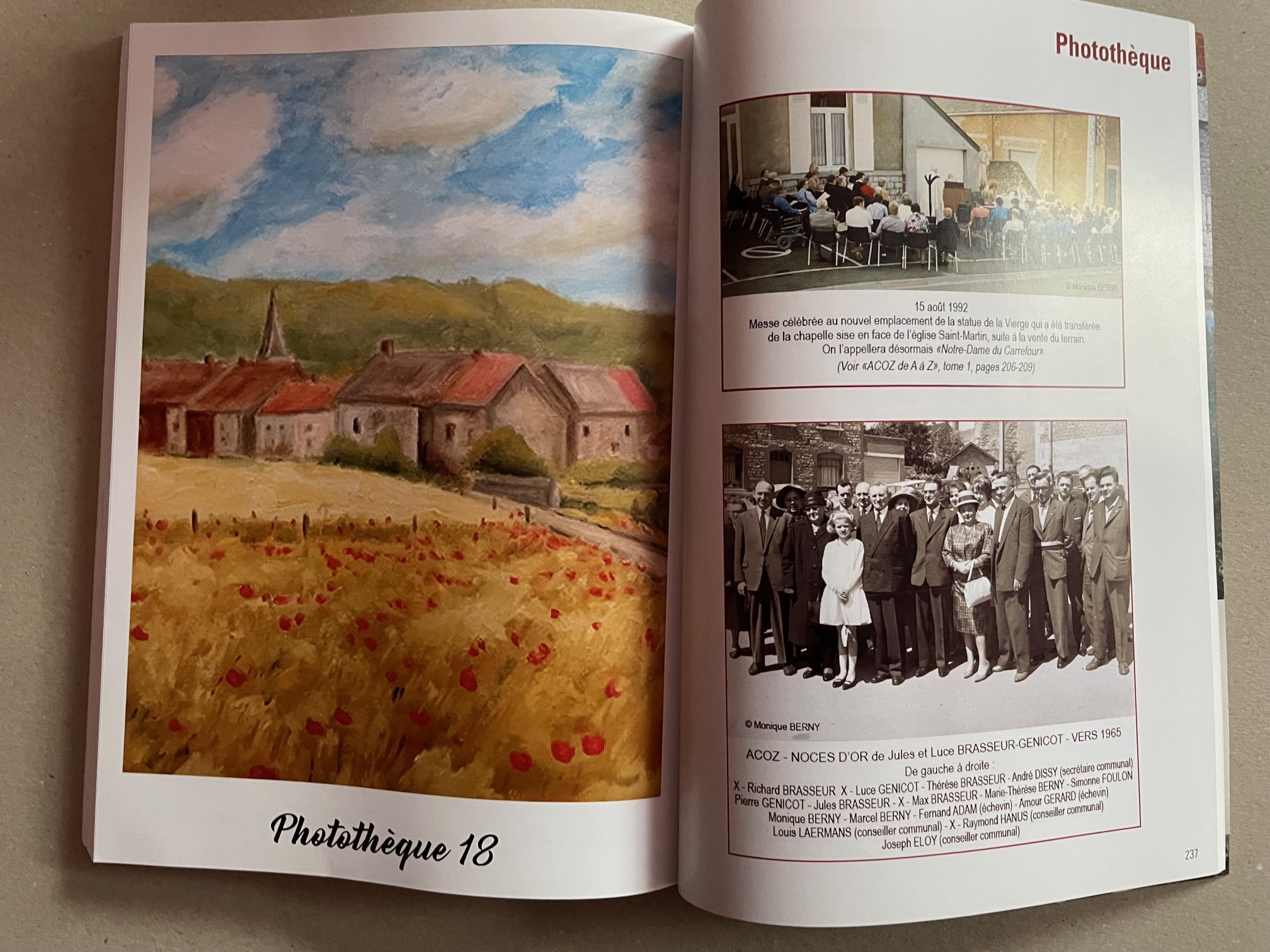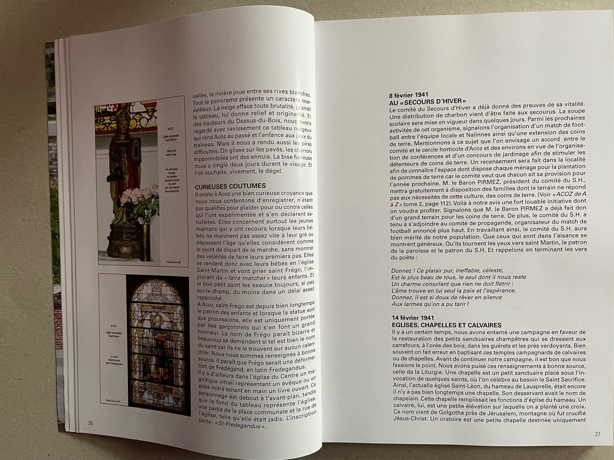 Le village ressemble à un véritable et immense jardin. Sur les plateaux s’étendent les moissons abondantes, les pommes de terre en rangs serrés, les trèfles touffus aux fleurs écarlates… Derrière les maisons aux jardins remplis de beaux légumes, il y a même de grandes étendues de légumes dans les champs. C’est que tout le monde a voulu s’assurer le plus de récoltes possibles. Dans un vaste terrain ont été plantées les pommes de terre nécessaires à la soupe distribuée aux enfants des écoles et aux nécessiteux de la commune. Acoz est un beau jardin et les efforts de chacun sont récompensés. Et, la garde veille…