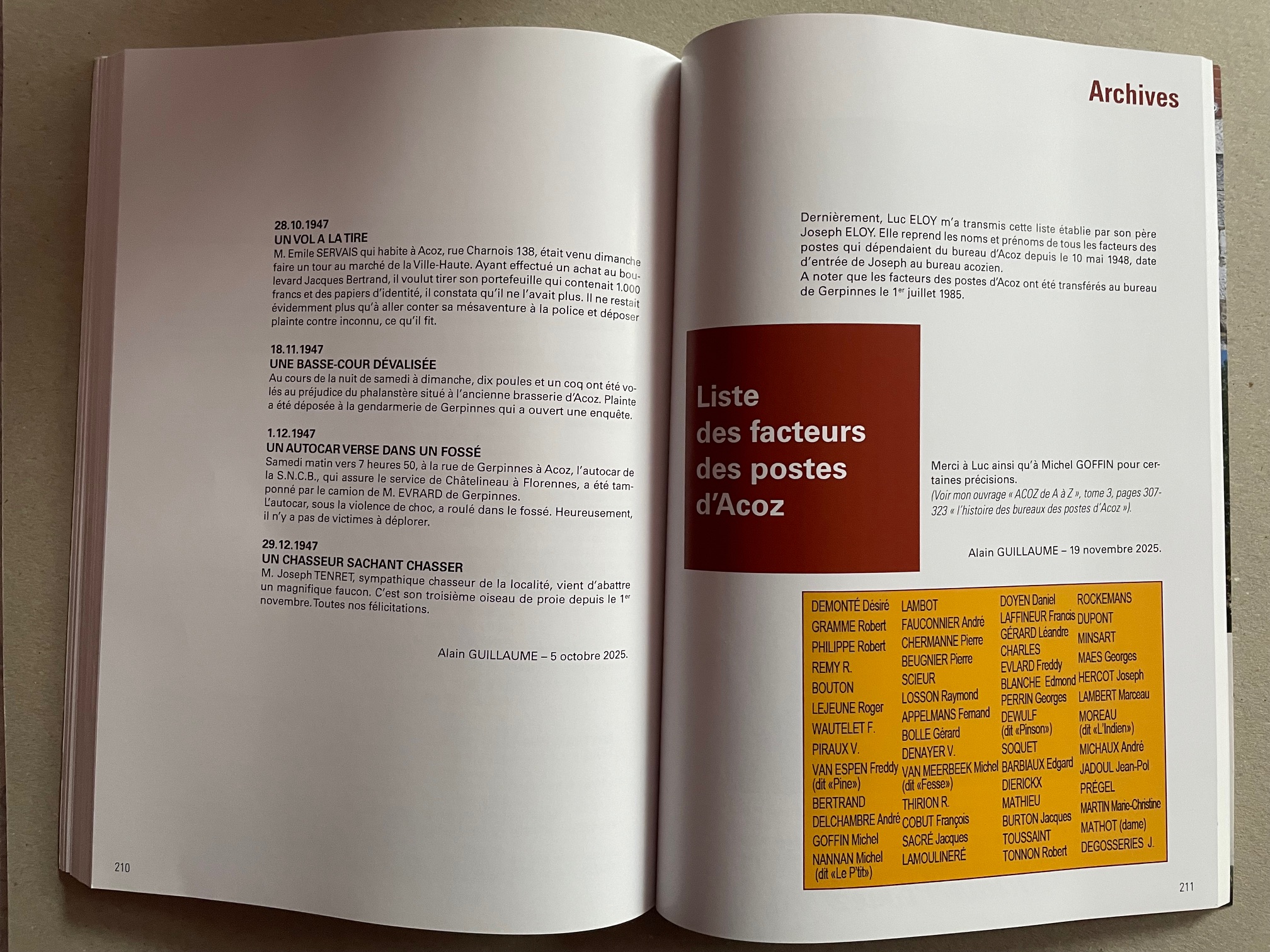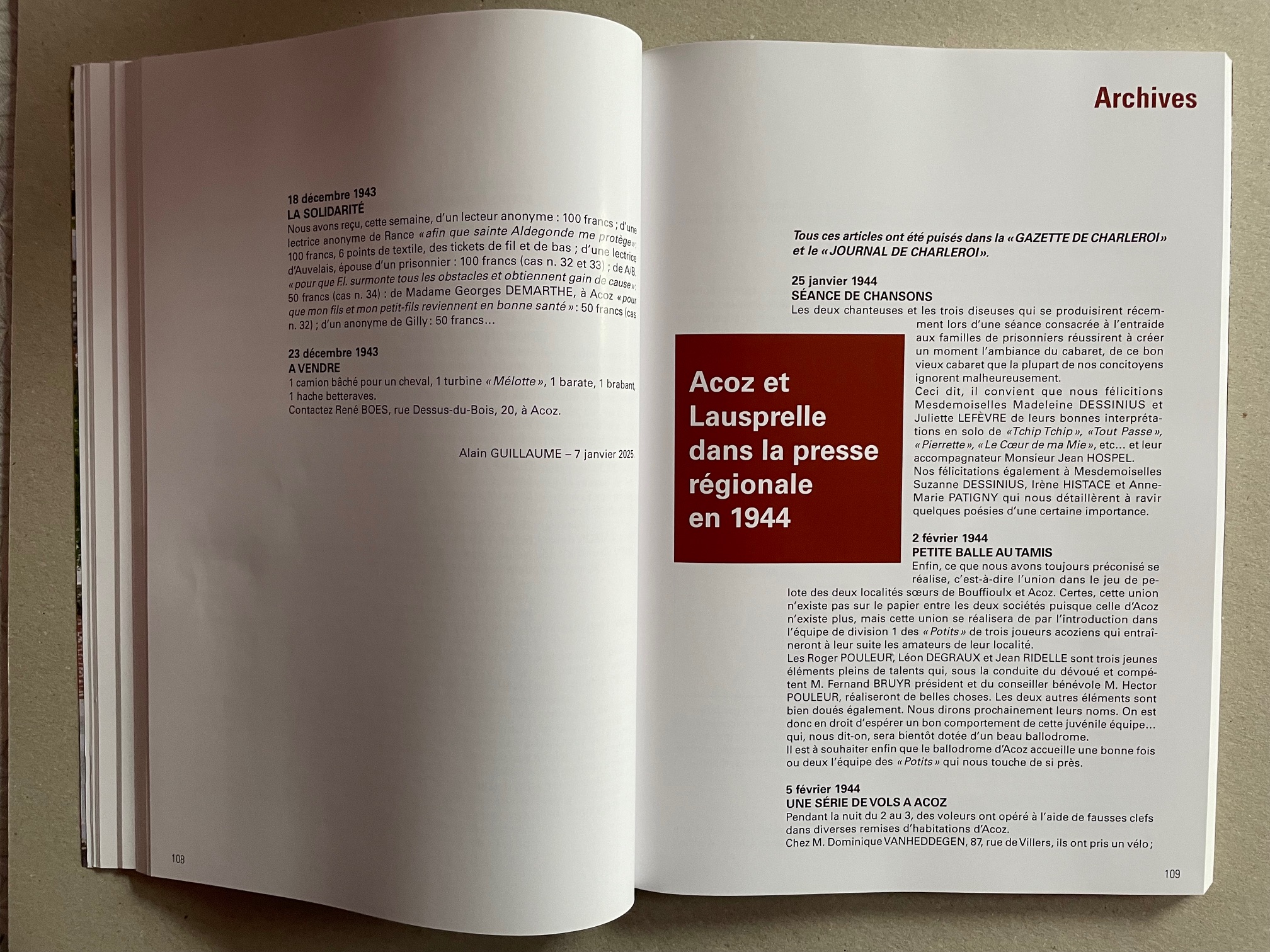 La « Journée du Prisonnier » organisée par l’association sportive « Jeunesse et Sports », avec l’appui des combattants de 14-18, a rapporté la somme de 1.522,50 francs qui se répartit comme suit : collecte faite à Acoz-Centre : 650 francs ; collecte faite à Lausprelle 380 francs ; lutte au jeu de balle : 492,50 francs. Le comité organisateur nous apprend qu’il avait l’intention d’envoyer un colis supplémentaire à chacun des 20 prisonniers de guerre. C’est la raison pour laquelle la somme avait été gardée dans la caisse. La chose n’étant pas possible, les ayants droit, épouses ou parents, recevront la somme à laquelle ils ont droit. Au nom des prisonniers de guerre, un grand merci.