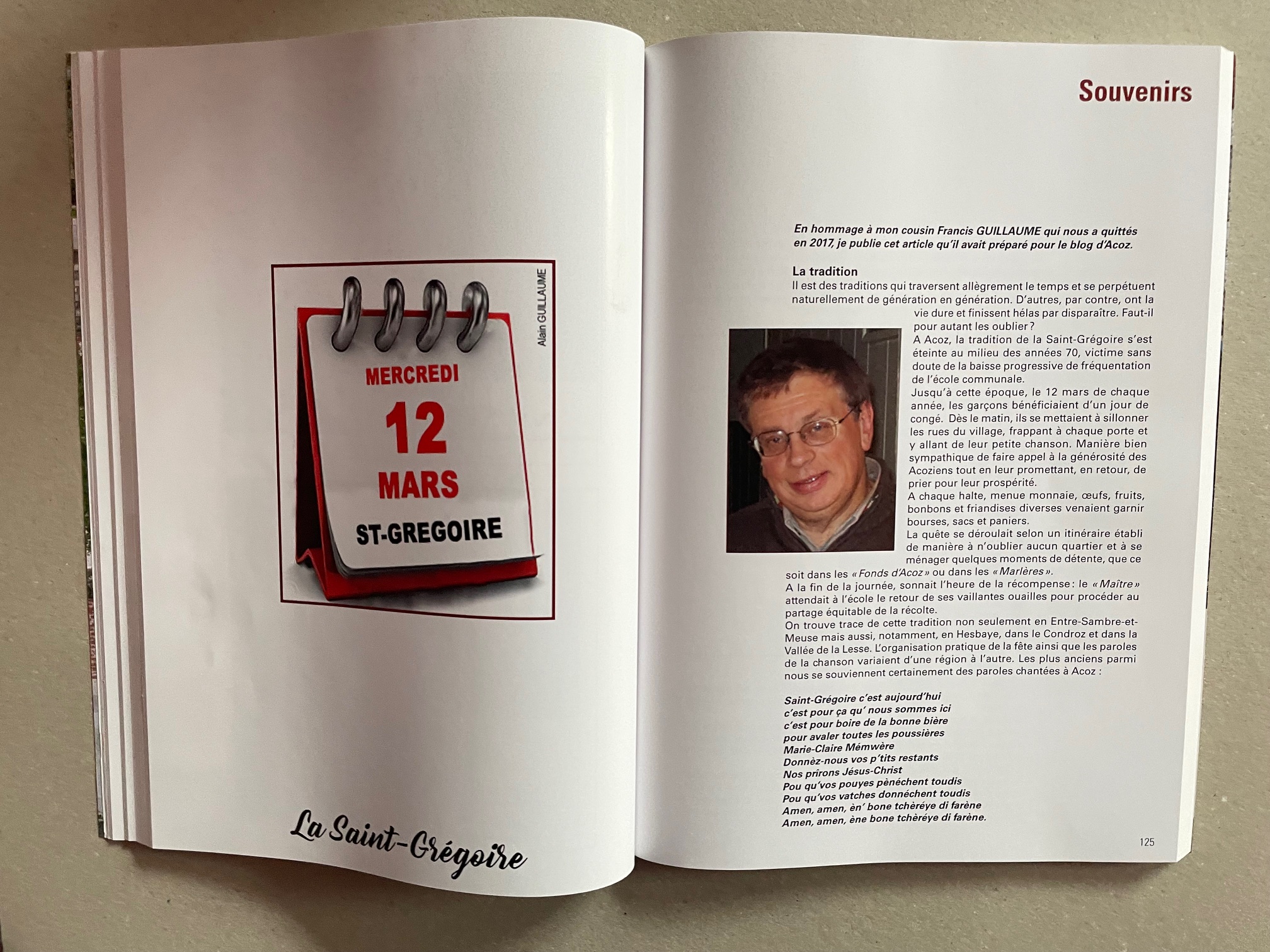 Il existe à Acoz une bien curieuse croyance que nous nous contentons d’enregistrer, n’étant pas qualifiés pour plaider pour ou contre celles qui l’ont expérimentée et s’en déclarent satisfaites. Elles concernent surtout les jeunes mamans qui y ont recours lorsque leurs bébés ne marchent pas assez vite à leur gré ou dépassent l’âge qu’elles considèrent comme le point de départ de la marche, sans montrer des velléités de faire leurs premiers pas. Elles se rendent donc avec leurs bébés en l’église Saint-Martin et vont prier saint Frégo, l’implorant de « faire marcher » leurs enfants. Et le bon petit saint les exauce toujours, si pas sur-le-champ, du moins dans un délai assez rapproché. A Acoz, saint Frégo est depuis bien longtemps le patron des enfants et lorsque la statue sort aux processions, elle est uniquement portée par des garçonnets qui s’en font un grand honneur. Le nom de Frégo paraît bizarre et beaucoup se demandent si tel est bien le nom du saint car ils ne le trouvent sur aucun calendrier. Nous nous sommes renseignés à bonne source. Il paraît que Frégo serait une déformation de Frédégand, en latin Fredegandus. Il y a d’ailleurs dans l’église du Centre un magnifique vitrail représentant un évêque ou un abbé mitré tenant en main un livre ouvert. Ce personnage est debout à l’avant-plan, tandis que le fond du tableau représente l’église, une partie de la place communale et la rue de l’église, telle qu’elle était jadis. L’inscription porte : « St-Fredegandus ».