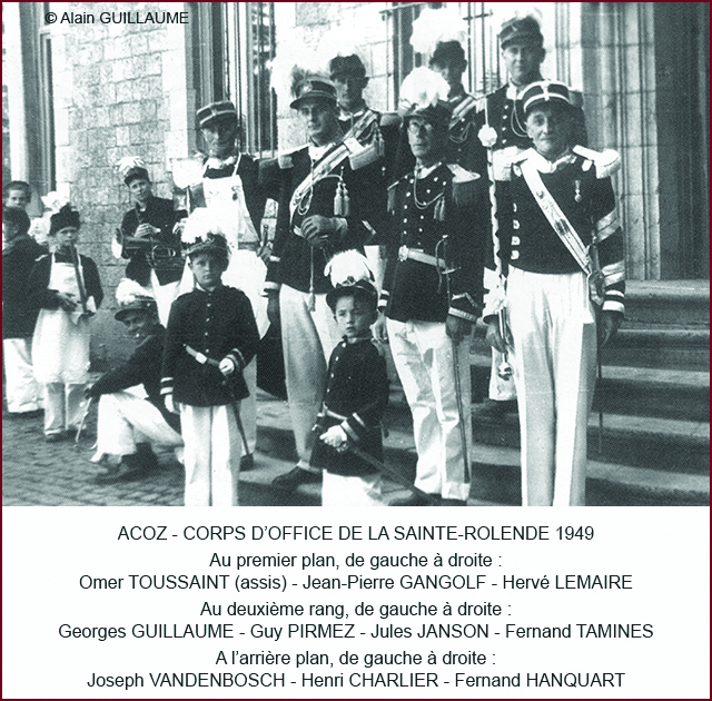 Sergent-sapeur : Georges GUILLAUME ; tambour-major : Fernand TAMINE ; major : Henri CHARLIER ; officier : Fernand HANQUART.