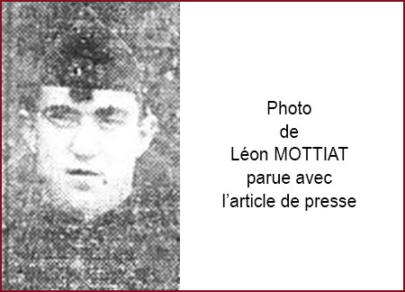 C’est de cette manière qu’il accomplit tout son devoir de légionnaire, en Afrique. Car, après avoir rempli ses obligations envers son pays, Léon MOTTIAT s’engagea à la Légion Etrangère dont la rude discipline l’attirait. Vint alors la guerre. Fait prisonnier, il travaillait dans une forêt d’Allemagne lorsque, surpris par la chute d’un arbre, la mort le frappa.